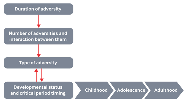 How long the adversity lasts can have an impact on development. However, it is often difficult to disentangle duration of adversity from the type of adversity (eg, children are often born into poverty, whereas maltreatment might begin later in a child’s life).